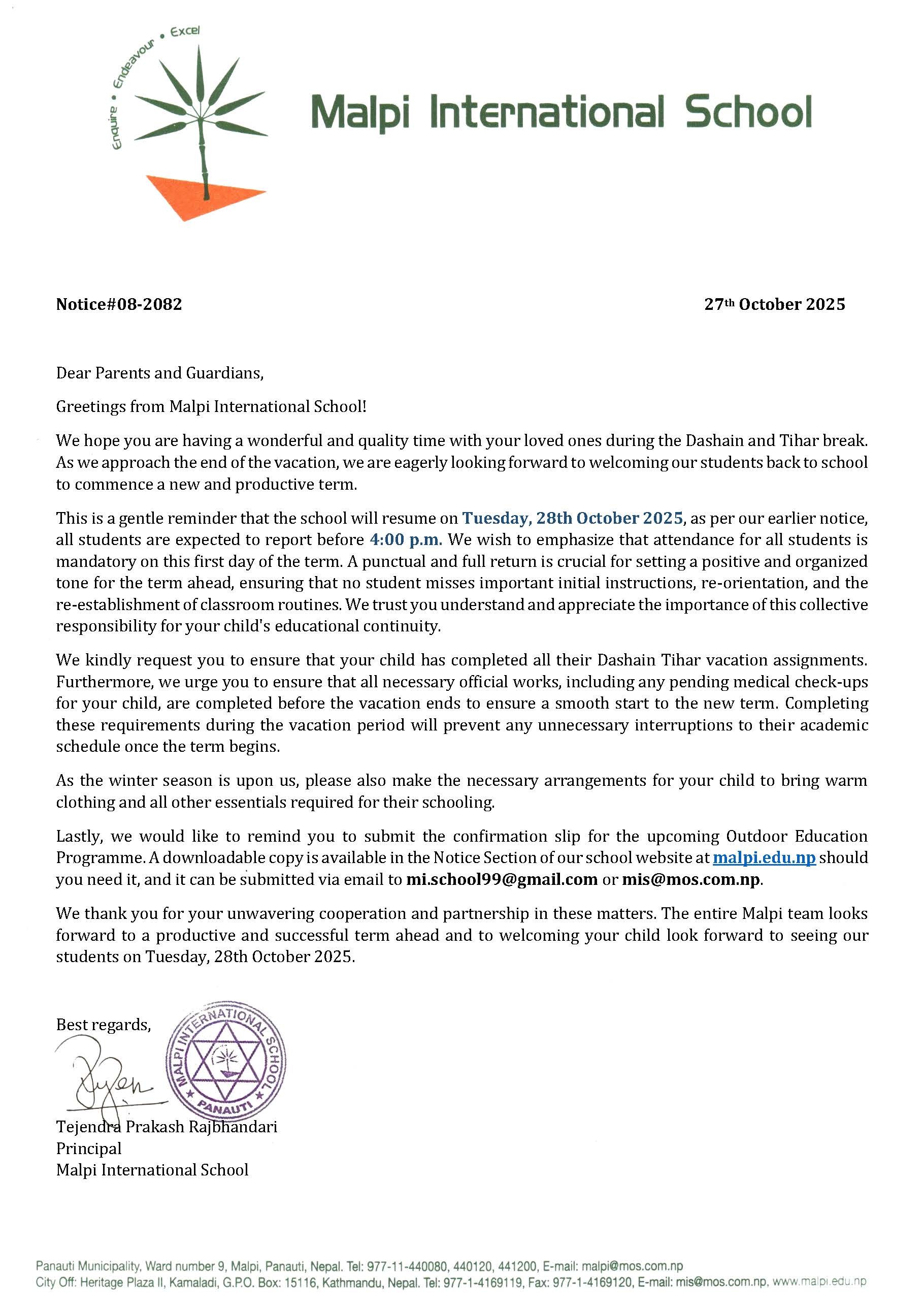 Please find enclosed the Notice#08-2025 with regards to the reoopening of School after Dashain-Tihar Vacation.